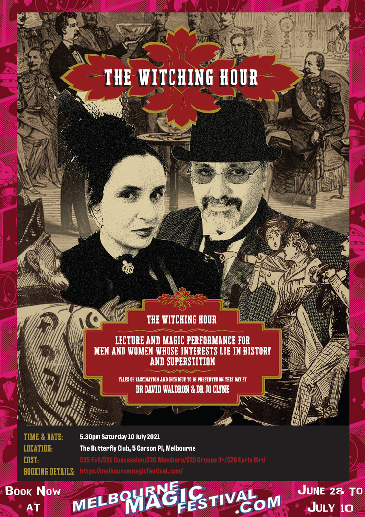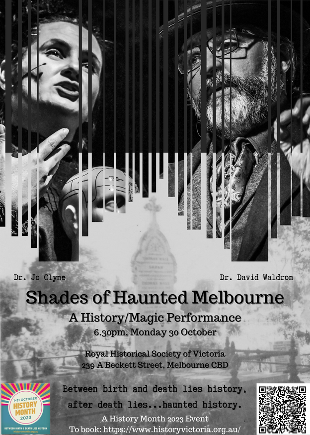 Dr Jo Clyne frequently performs with her colleague Dr David Waldron in shows featuring their own special blend of historical research and illusion. Recent performances have taken place at Ballarat Heritage Month, The Melbourne Magic Festival, the Goldfield Gothic Festival of Dark Ideas, and History Month. Please get in touch if you are interested in a lecture or performance.